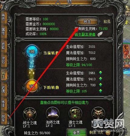 另外,转生后会有转生之力,转生之力可以用来提高923yx《武易》中的魄力——战士之魄、法师之魄、道士之魄、野兽之魄。这些魄力可以减少相应职业对自身的伤害。
