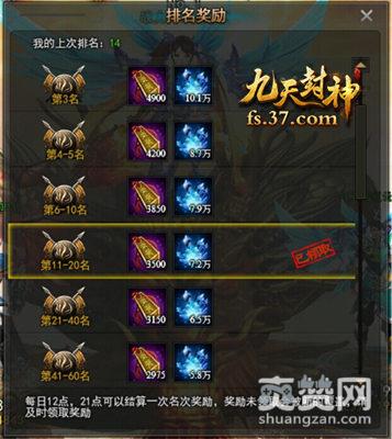 当37《九天封神》的玩家挑战胜利后,在榜单上的排名便会上升,并获得挑战奖励,每一次的胜利系统都会给予奖励,对于优秀的玩家,系统给予更给力的奖励是高于历史最高排名还可获得排名上升奖励,只要玩家冲到第一马上可以领取全部奖励。