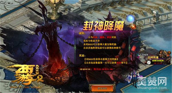 妖、魔、神三界争霸,激战一触即发!在37《西游伏妖篇》的封神降魔中,玩家可以同时与BOSS还有其他阵营的玩家激战,活动于每天20:30-21:00开启,活动开始后,玩家将分别与妖、魔、神三族对抗,危机与收益并存,活动期间,将BOSS击杀可以获得大量奖励,而击杀其他阵营的玩家数量最多的还可以获得本阵营的杀神称号!