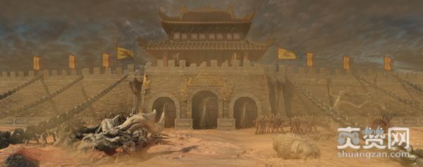 黄沙漫漫,乌云密布,城门紧闭,城墙无一士兵,似乎是一座早已被遗忘的沙城。但城墙上迎风飘扬的旗帜、城门前一片狼藉的战后遗骸与之鲜明的对比,似乎是想告诫外来侵略者:“这里曾发生过无数战争,但都被我军一一击退,我军早已强大到无需士兵足以抵抗你们。”如此狂傲的城主,是否下一次还能守住他的沙城呢?