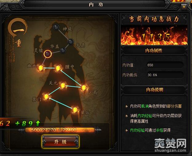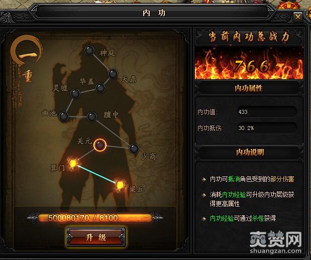 一重升级关元所需内功经验:8100,初始内功值:433,内功抵伤:30.2%。