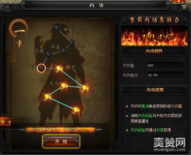 一重升级曲池所需内功经验:18600,初始内功值:602,内功抵伤:30.5%。