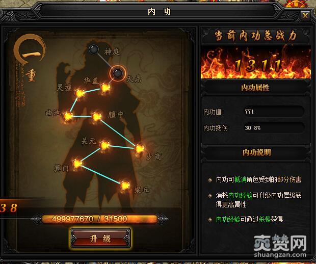 一重升级天鼎所需内功经验:31500,初始内功值:771,内功抵伤:30.8%。