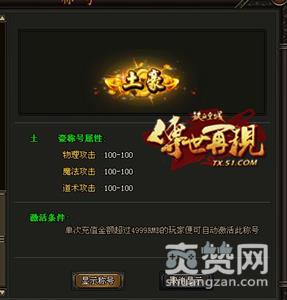这就是江湖上各大职业最牛逼的头衔,各类攻击直接+200,不过比起铁血霸王的+500还是弱爆了太多。再看看一些偏才的称号,各项攻击都+100,话说有总比没有好。后面这些称号更容易夺得,前两类基本上是很困难,往往被51《铁血皇城》中的人民币玩家所把持。想要赢得51《铁血皇城》中的头衔,你必须付出百般的努力。必要时还要充值赚奖励,购买升阶石来提升一些属性加成。放手一搏,去赚取江湖上你的第一个头衔吧!