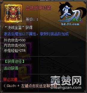 寒刀现世,少侠今何在?魔王问世,荣耀谁加冕?决战金銮又有哪位英雄能够脱颖而出,穿上最终象征胜利者的血色时装?一夫当关万夫莫开,顶层战甲就在那静静地等待着英雄归来,金光闪闪的战衣,变态的属性加成,更有荣誉值可兑换商城各种超值道具,勇士们还等什么,快来51《寒刀》金銮大战一决雌雄吧!