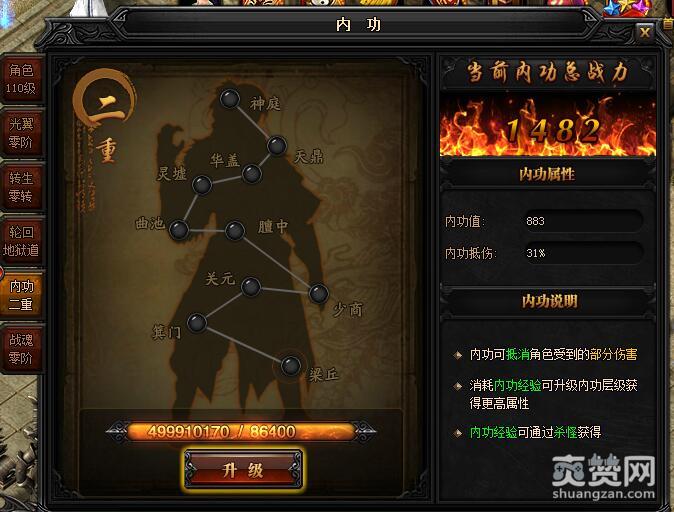 在XY游戏《蓝月传奇》中,内功界面就在第一个角色按钮之下的第五个选项卡便是。内功可抵消角色受到的部分伤害,消耗内功经验可升级内功层级获得更高属性,内功经验可通过杀怪获得。一开始,在内功没有被激活的情况下,也就是一重一个经脉都没卡启的情况下,内功总战力是576,内功值为320,内功抵伤为30%。