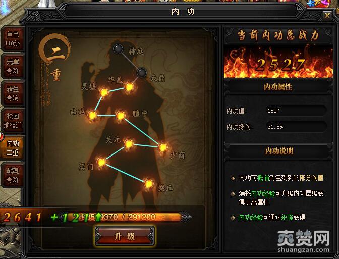 二重升级天鼎所需内功经验:291200,初始内功值:1597,内功抵伤:31.8%。