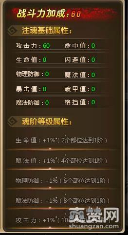 装备注魂达到一定的魂阶等级还可以获得额外加成.魂阶等级的提升需要玩家装备部位的品阶达到一定阶段.魂阶等级属性生命值提升需要2个部位达到1阶,魔法值需要4个部位达到1阶,物理防御提升需要6个部位达到1阶,魔法防御提升需要8个部位达到1阶,攻击力提升需要10个部位达到1阶.装备部位品阶越高,装备魂阶等级属性也就越高.