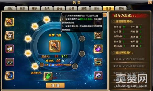 装备注魂可以对角色的十个装有装备的部分进行注魂,分别为武器、衣服、裤子、鞋子、两枚戒指、帽子、披风、手套和腰带.只有装有装备的部位才可以进行注魂.装备注魂提升的属性会永久有效,不会因为更换装备而发生变化.