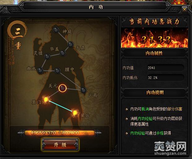 三重升级关元所需内功经验:802800,初始内功值:2041,内功抵伤:32.2%。