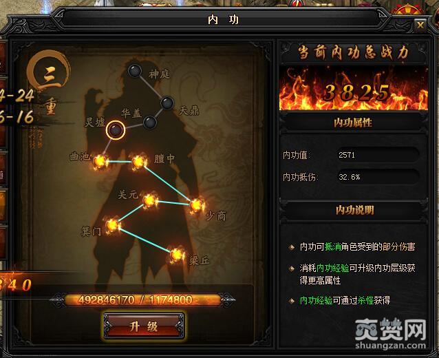 在XY游戏《蓝月传奇》中,内功界面就在第一个角色按钮之下的第五个选项卡便是。内功可抵消角色受到的部分伤害,消耗内功经验可升级内功层级获得更高属性,内功经验可通过杀怪获得。一开始,在内功没有被激活的情况下,也就是一重一个经脉都没卡启的情况下,内功总战力是576,内功值为320,内功抵伤为30%。随着内功一个个经脉被开启,重数也会增高,内功值和内功抵伤都会变高,同时升级所需的内功经验自然也就会变大。下面,就让我们看看内功三重的升级属性及所需内功值一览。