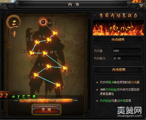 三重升级神庭所需内功经验:1500000,初始内功值:2968,内功抵伤:32.9%。