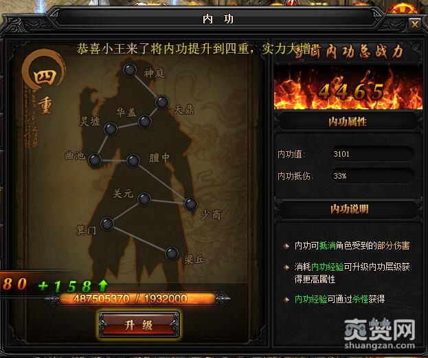 三重升级箕门所需内功经验:720800,初始内功值:1908,内功抵伤:32.1%。