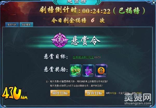 43u《修天决》悬赏榜玩法中众星云集,任何人都能在榜单中刷新自己的成就,让全服玩家看到自己的不朽伟业。悬赏榜上难度从一星到四星递增,一旦揭开榜单,玩家便要努力完成自己的职责,一星怡情,四星那就没那么容易了,若无法完成,还需花钱消榜或等待一日。