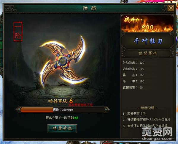 暗器,看似虽小,却有出其不意的特效,电光火石暗箭难防,而在360uu《寒刀》中,同样有花样百出的暗器等待你来打造。在游戏中暗器将为玩家提供所有直接攻击属性,内外功、暴击命中和直接伤害,可以说暗器将是提升玩家攻击实力的最大保证。目前暗器共有十阶构成,玩家们可以通过使用寒铁来不断铸造打磨,而寒铁则可以通过各种日常活动来获取,现在开始,就培养你的暗器,在360uu《寒刀》的世界里杀出你的英雄路!