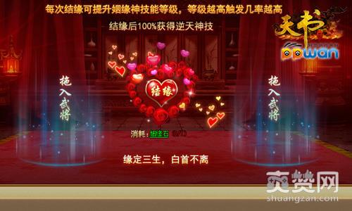 正常情况下男女结婚繁衍子孙万代,但是在ppwan《天书世界》中,男女神将结缘却100%衍生出逆天神技。点开武将系统武将情缘子系统,将你想结缘的男女神将拖入对应位置消耗结缘石就可将两武将结缘。不过,在ppwan《天书世界》中仅特殊女神将才可进行结缘,结缘后女神将将会消失,男神将获得神技传承。后续可使用相同的女神将继续结缘,每次结缘都可提升姻缘神技的等级,进而提高神技的触发几率!
