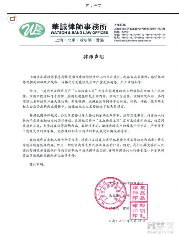 5月23日下午,鹿晗工作室就此发表严正声明,称之“均为恶意造谣”,并称已经完成对各平台的所有造谣的取证工作,将进一步维权。随后,鹿晗经纪人杨思维也微博发声,“取证过程虽然复杂,但有法可依,法盲们不要觉得匿名胡说八道就没事了。”