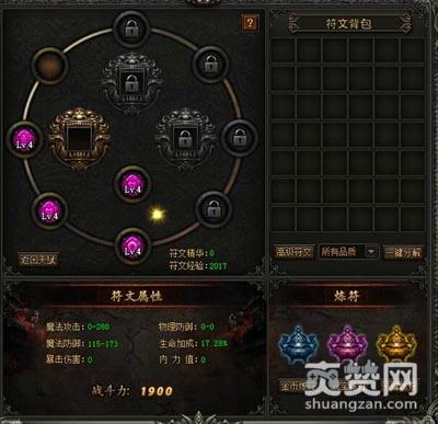 符文系统是在天赋达到1级时开启的,共有两种符文——普通符文和高级符文,每一种符文下有多个符文类型。另外,符文拥有不同的品质和等级。符文品质共有4种:白、绿、蓝、紫,品质等级越高的符文,属性加成也就越高。符文初始等级为1级,最高可以升级到10级。