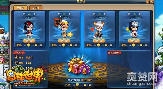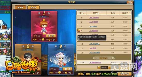 竞技场风云榜是腾讯《冒险世界ol》中的一个创新玩法,玩家不但可以在排行榜查看所有玩家的名次,还能膜拜其他玩家,膜拜后可以获得胜点奖励。风云榜中还有一个十分独特的玩法,那便是天梯风云幸运奖励。每轮竞技场都会随机出现若干个幸运名次,位居幸运名次的玩家将得到额外的绑钻奖励,幸运排名每日刷新,每日零点发放。