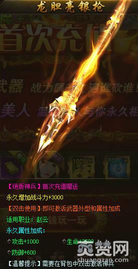 玩家可以通过首次充值可获得绝版神兵龙胆亮银枪。