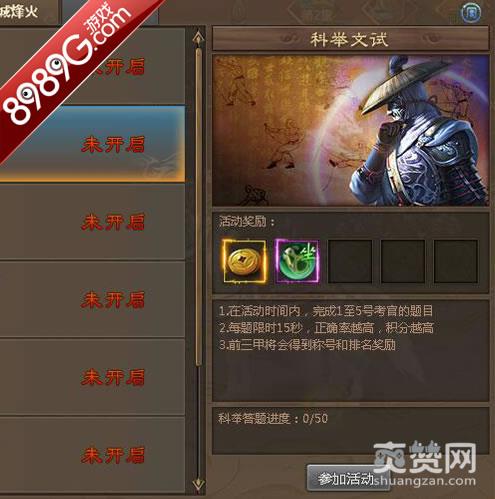 8989G游戏《不良人》每周二、四、六12:00-14:00面向所有等级大于等于31级的玩家开放,科举武试玩法新颖、有趣、乐趣多多,有大量铜钱、坐骑训练丹等丰厚奖励大家不要错过哦!!