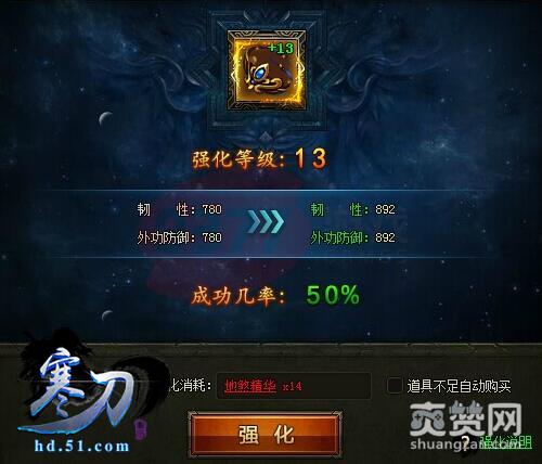 如果你想在51《寒刀》里称霸武林,如果不能拥很强的好装备,那么一路是非常艰辛的哦!51《寒刀》加入了装备升星级的玩法,这也让玩家得到装备而多了一个方法;在51《寒刀》游戏里,每件装备满级可以升到15星,可大幅度提升装备属性。不同等级的装备升星,消耗也不同,1-7星升星消耗地煞强化精华,8-15星升星消耗天罡强化精华。51《寒刀》装备星级越高,消耗的精华越多,升星失败会获得祝福值,当祝福值满后,下一次升星必定成功!
