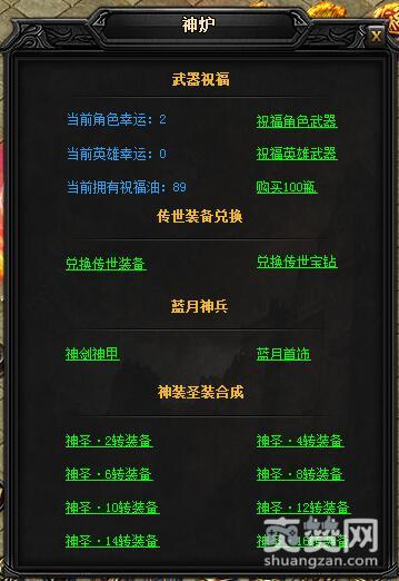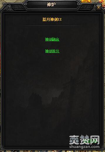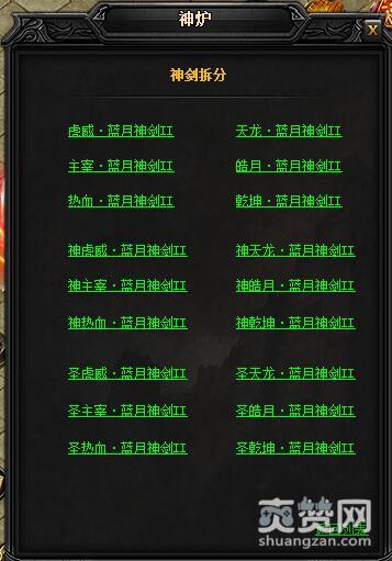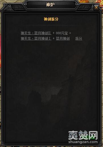 拆分的方法是到神炉处,点击蓝月神兵中的神剑神甲,然后在弹出的对话框中选择一项。这里我们选择的是蓝月神剑II。