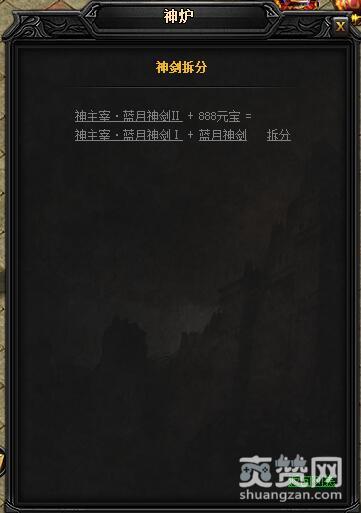 拆分的方法是到神炉处,点击蓝月神兵中的神剑神甲,然后在弹出的对话框中选择一项。这里我们选择的是蓝月神剑II。