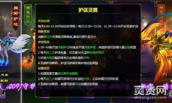 那是哪里呢?那就是傲天乾坤战纪每日定时活动“护送灵兽”!哪些灵兽可以护送呢?送一次可以拿到多少经验值奖励?千万别急,小编慢慢给你道来。一共分为五大颜色和层级的灵兽,从白狐到金龙,护送不同层级的灵兽收获的奖励完全不同。玩家每日可以选择护送3次,劫镖3次,如果要劫镖估计对自己的战力必须要有高度的自信才可以喔。