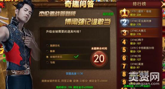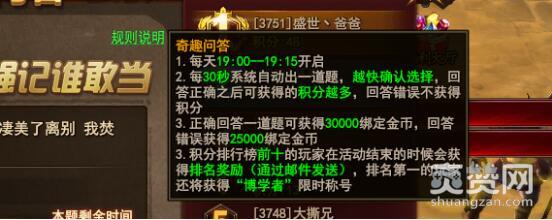 傲天魔法王座的趣味答题在每天19:00开启,耗时15分钟。每30秒钟出一道题,越快确认获得的积分越多,回答错误不算积分。答题奖励非常丰厚:答对一道题30000绑定金币就是你的了,回答错误也能拿到25000绑金。除此之外答题积分排行前十的玩家在活动结束后可以获得“排名奖励”,第一的玩家还可以收获“博学者”的限时称号。这就是趣味答题中满满的福利。