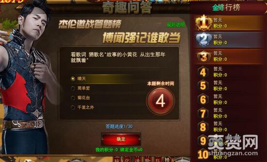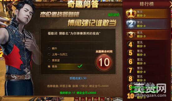 这首歌相对陌生一些,好像是杰伦在雪碧广告里面放过。当然这下也完全不必多说,肯定是《我要夏天》。一连回答了10多道关于杰伦的问题,几乎全是满分,不错哟!一开始小编以为所有30道题都和周董相关的,后来才发现也有一些关于傲天魔法王座游戏的内容,好久没上来玩了稍微有点生疏。