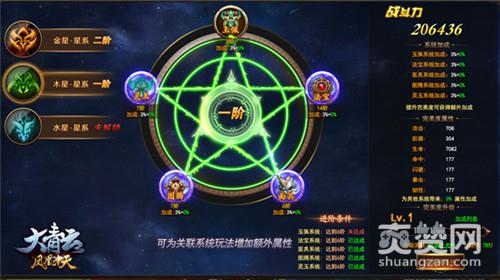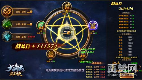 当玩家角色达到350级以上,即可开启星系系统。星系中包含金星系、木星系、水星系三大星系,每个星系下对应着5个升阶系统。金星系对应了宝甲、魔扇、圣纹、盾牌、坐骑;木星系对应了玉佩、灵玉、图腾、法宝、面具;水星系对应了神兵、魔像、守护、火炮、兵器。