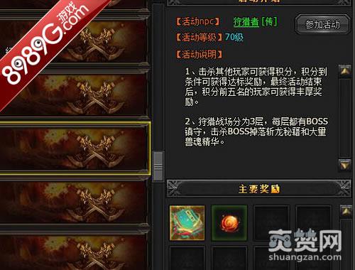 既然是王者盛宴那就只有高级的强者才能参与了,8989G《无双》仅对等级75级以上的玩家开放,狩猎场内击杀其他狩猎者可以活动积分,狩猎场有三层,层数越高积分奖励也会高,提示一下,狩猎场上死亡不掉装备不掉积分,勇士们,尽情的厮杀吧!