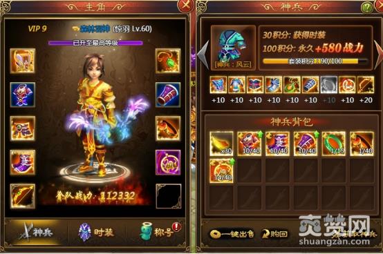 主角界面包括主角神兵、神兵图鉴、时装、称号四个功能,装备神兵可以直接提升全队战力,注意是全队哦!而集齐一套神兵则可以激活时装和时装属性,不同时装的属性还可以叠加,时装属性同样也是提升全队战力的。