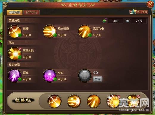 点击“技能”按钮即可打开“主角技能”界面,分为“基础技能”和“秘传技能”两种,如下图所示: