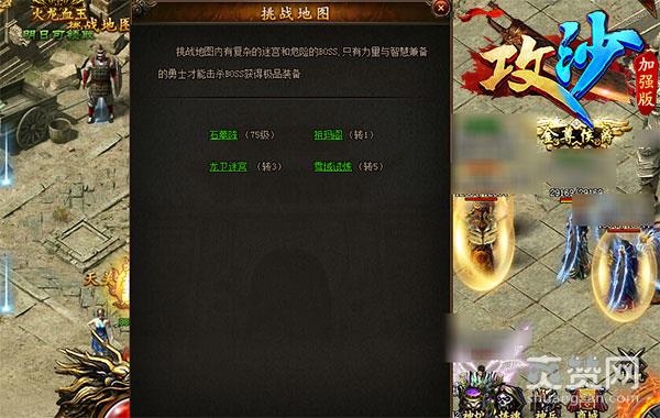1、游戏中,有石墓阵、祖玛阁等4种挑战地图,根据玩家等级依次开放,玩家的等级越高,可以进入的挑战地图就越多;