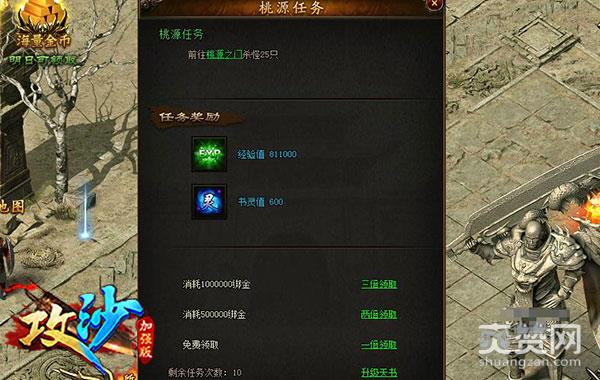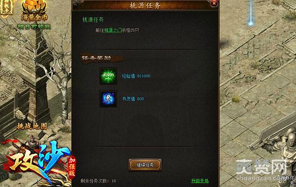 《攻沙》加强版中,桃源任务玩法是一个全天候的日常玩法。玩家每天都有十次机会前往桃源之门击杀怪物,完成任务可获得大量的经验值和书灵值!在桃源之门的怪物中十进十出,神挡杀神,佛挡杀佛!