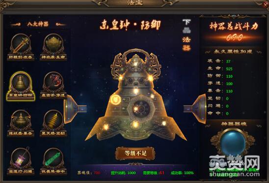 主管生命的神农鼎,相传是神农氏炼药的器物,采集天地之灵气、万物之精华。神农鼎内孕育了各种奇特的生命动能,可以帮助玩家大幅提升生命值。右侧925的生命值同样只能是初级下品的法器,想要傲天乾坤战纪中生命值强大,一定记得提升神农鼎的品阶喔。