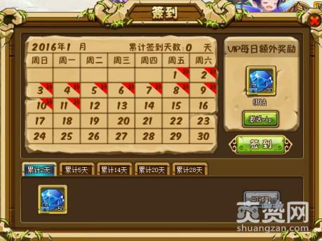 活动内容:活动期间内,玩家在游戏里每天可以签到一次,每个自然月达到一定签到天数后可以领取一次奖励,VIP玩家每天可以额外领取一次奖励。