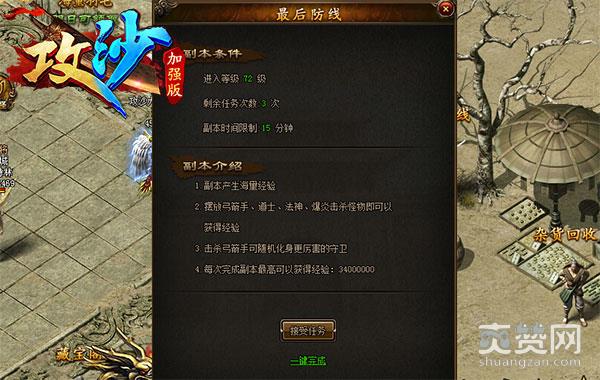 1、在游戏中,玩家完成最后防线任务,将根据击杀怪物数量,得到海量经验奖励;