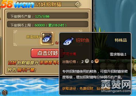 玩家可以使用免费招财和钻石招财来获得招财鱼.积累一定数量的招财鱼就可以用来讨好招财猫,从而增加招财猫的亲密等级.玩家与招财猫的亲密等级越高,那么讨好招财猫时需要的招财鱼也就越多.每天0点、12点、18点可免费招财,钻石招财需要消耗10钻石.