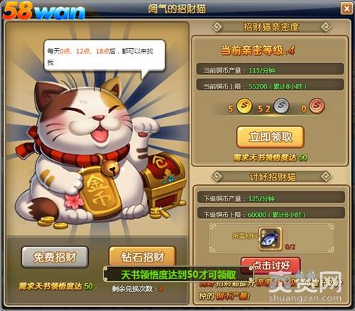 招财猫有免费招财和钻石招财两种玩法.免费招财是有冷却时间的,每天0点、12点、18点可免费招财,每天的第一次免费招财是没有要求的,但是进行第二次免费招财的话就需要玩家的天书领悟度达到50.钻石招财则需要玩家花费钻石才能进行招财.