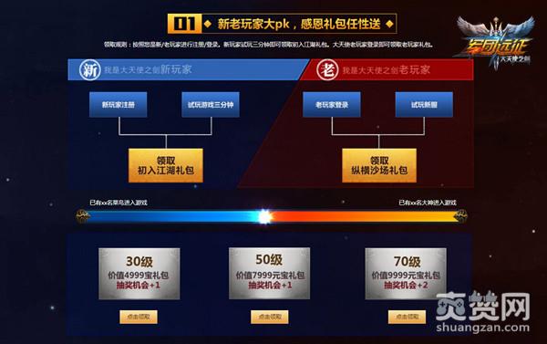 无论是老前辈,还是新成员,在37《大天使之剑》新服中试玩达到30/50/70级还能领取价值4999/7999/9999元宝的土豪礼包!就是这么慷慨,话太投机送礼包,不想说话送礼包,话锋一转还是送礼包,大后方的补给源源不断,快去冲锋陷阵吧!