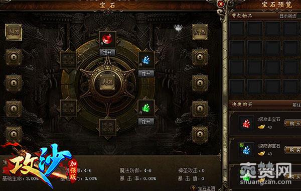 在哥们网《攻沙》中,不同颜色、不同种类的宝石有着完全不同的属性,比如:红宝石可以提升玩家的攻击力;蓝宝石可以提升玩家的防御力;绿宝石可以提升玩家的生命值和魔法值……