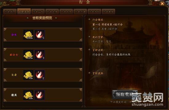 第二层可以看看官职奖励。会长、副会长、长老、精英都会有奖励,奖励分为金币和光翼进阶丹,三六九等各有各的俸禄。