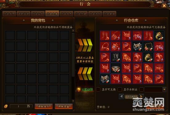 接下来看到的将是行会中的武器库,哪里来这么多高级装备?都是行会中同仁浴血奋战爆回来的,想要?简单。只需要在傲天烈火封神有高额的行会贡献值就可以搞定,行会贡献值可以通过投入装备和捐献金币等来获得。一定要不断扩充自己的贡献值,等到你想要装备的时候可以随心所欲兑换很多。