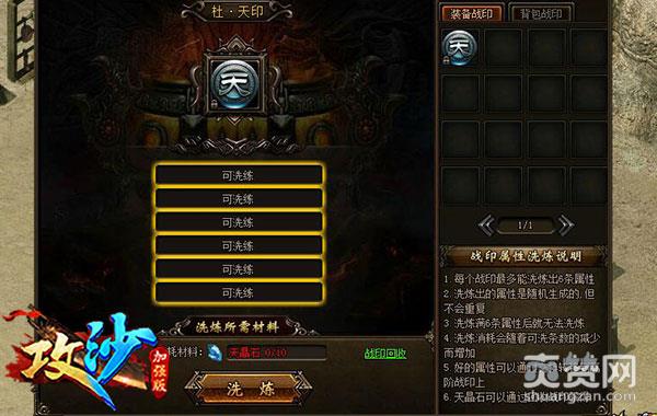 战印是角色副装的装备,玩家在击杀BOSS中有几率获得战印,一共有:天、地、人、风、云、龙、虎、鬼、神九种。玩家可以对每个战印进行洗炼,增加装备的属性种类。每个战印最多可以洗炼出6条随机属性,而且属性各不相同,好的属性甚至可以通过交换转移到高阶战印上!