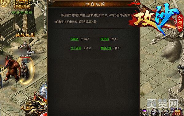 1、在游戏中,挑战地图分为石墓阵、祖玛阁、龙卫迷宫和雪域试练四种地图,根据玩家的等级开放;