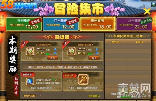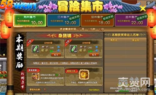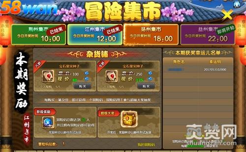 58wan《冒险世界》冒险集市分为四个集市,分别为荆州集市、江州集市、扬州集市和益州集市.每个集市都分为三块,杂货铺、阶段奖励和超级大奖.四个集市的阶段奖励都是一样的,但是杂货铺出售的商品和超级大奖的奖励都不一样,并且每天四大集市的商品道具都会发生变化.