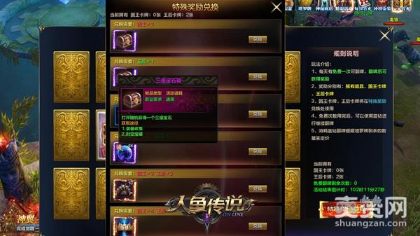 当角色等级达到49级时会开启塔罗牌系统,塔罗牌并非永久存在,在开启后仅有9天时间可以体验。玩家每天有一次可以免费翻牌的机会,翻牌可以获得宠物蛋、经验丹、50W金币等奖励。除此之外,玩家还有一定几率抽取到稀有的国王和王后卡牌,这两张卡牌可用于兑换稀有奖励,进入“特殊奖励兑换”界面,根据自己手上的牌数兑换各种稀有的资源。